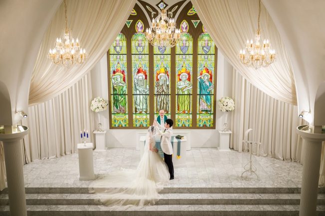 チャペル正面には5人の聖人が描かれたステンドグラスがあります。聖人の前で愛を誓う本格的な挙式ができます。また、チャペルサイドにもステンドグラスが施されており、チャペル全体を明るく照らしてくれます。バージンロードも大理石でできており、イスなどもすべて白で統一しておりますのでとても可愛らしい印象になります♪ご家族の皆様に見守られながらアットホームな挙式がしたい方におすすめです。