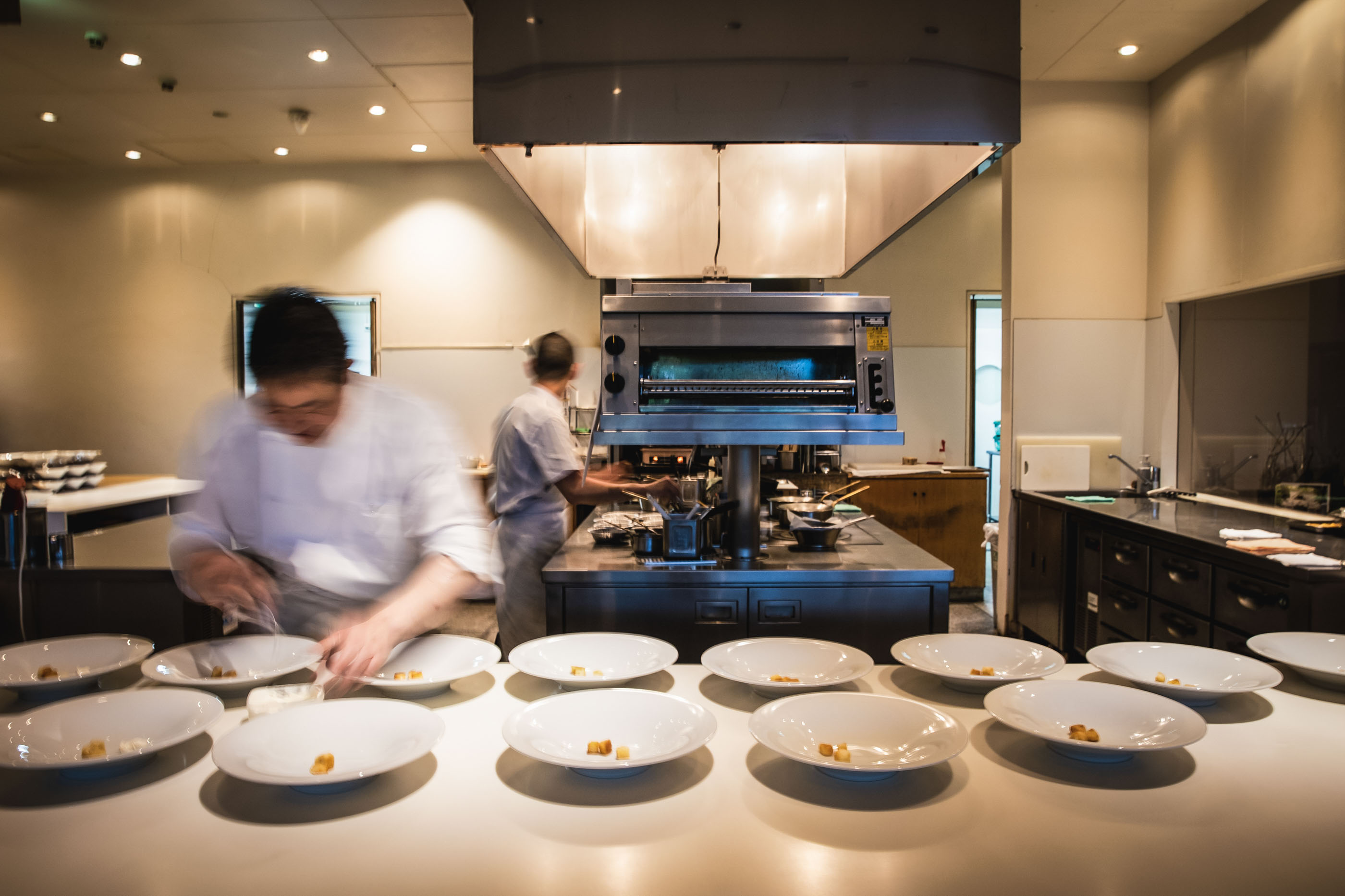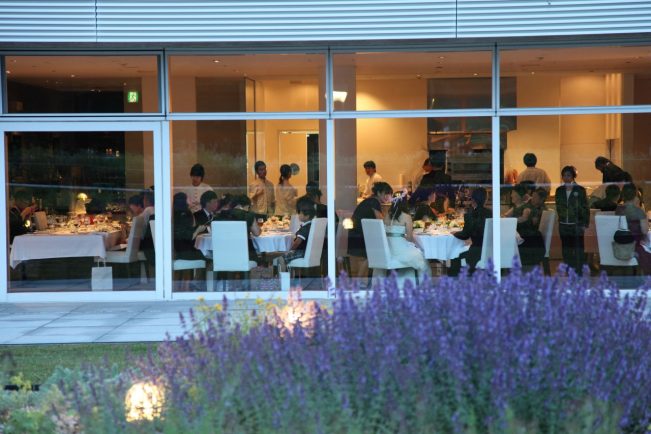 札幌郊外にあるイサムノグチデザインの公園内にあるフレンチレストラン。道産素材にこだわったシェフの出来立てのお料理が、オープンキッチンから運ばれます。
