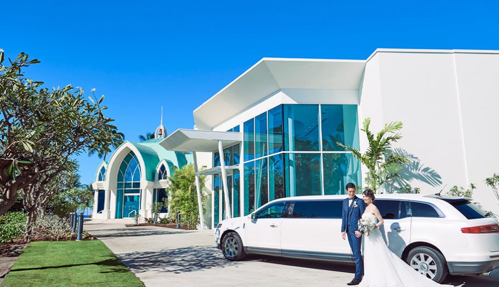 目の前には、青い海に映えるコオリナラグーン。大きな窓から見えるのは、海風に揺れるヤシの木と、陽光がまぶしい白砂のビーチ。ハワイの自然がすべて揃う、貴重なロケーションに抱かれた純白のチャペル