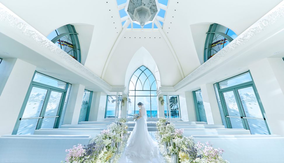 チャペルの目の前には、コバルトブルーの壮大な海。数あるチャペルの中でも、特に希少なロケーションです。このチャペルならオンザビーチのロケーションで写真撮影もお楽しみいただけます。