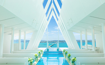 「幸せを運ぶ神の使い」とも言われる海亀をモチーフにした白亜のチャペル。大きな天窓は、青く輝く大空へとつながり、祭壇へと続くガラスのバージンロードは古宇利ブルーの美しく豊かな海へと繋がります。