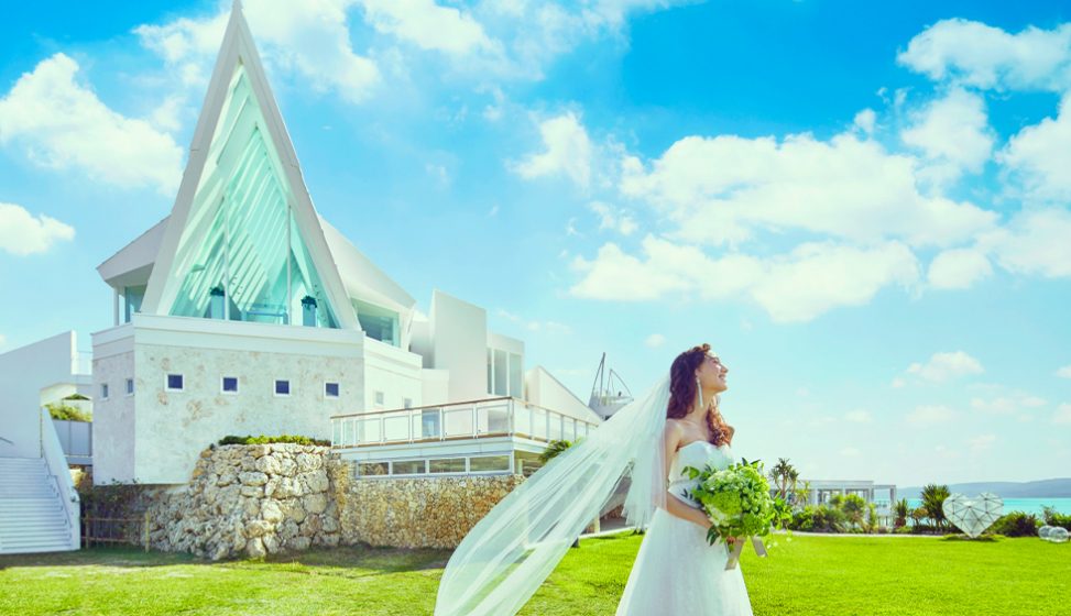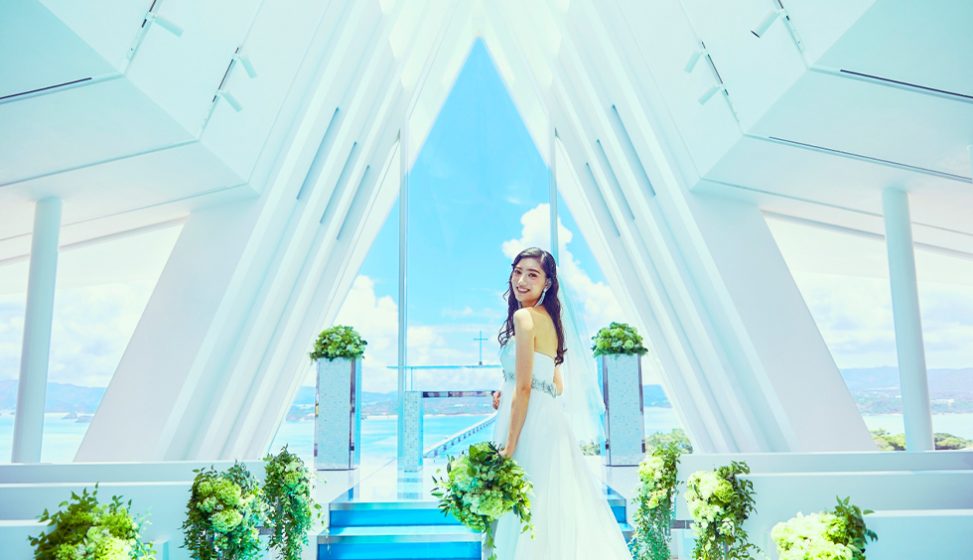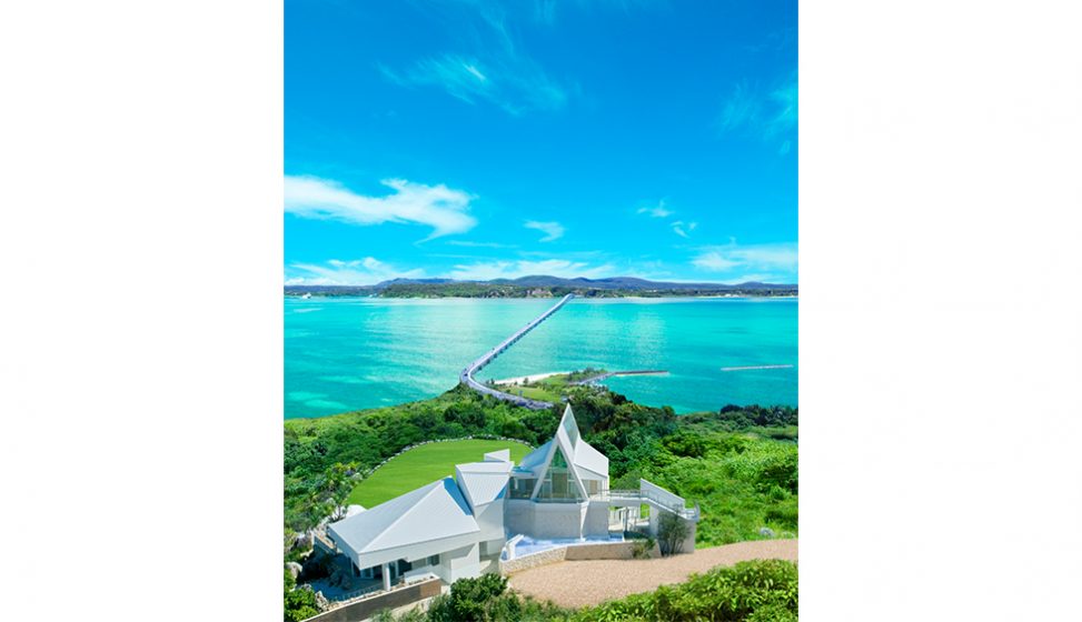 沖縄本島の北部、エメラルドグリーンの海に囲まれた小さな島「古宇利島」。古宇利オーシャンタワーに隣接する、絶景のプライベートガーデンに「幸せを運ぶ神の使い」とも言われる海亀をモチーフにした白亜のチャペル。