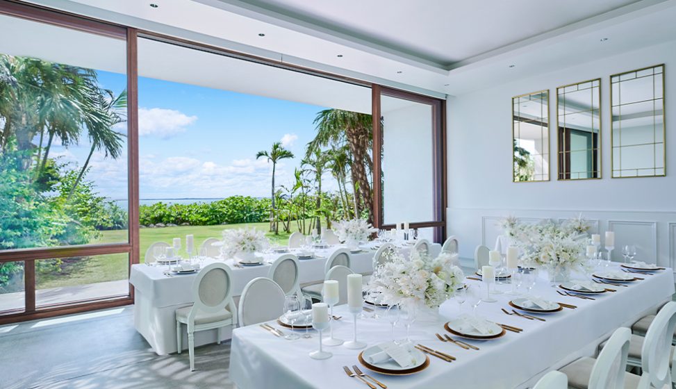 ウエディングリゾートならではのプライベート感と、プレミアムで上品な雰囲気を同時にかなえる空間。沖縄の旬の食材で仕立てたこだわりのフレンチでゲストをおもてなし。愛するゲストみんなが、笑顔に包まれる、優雅で美しいひとときを。