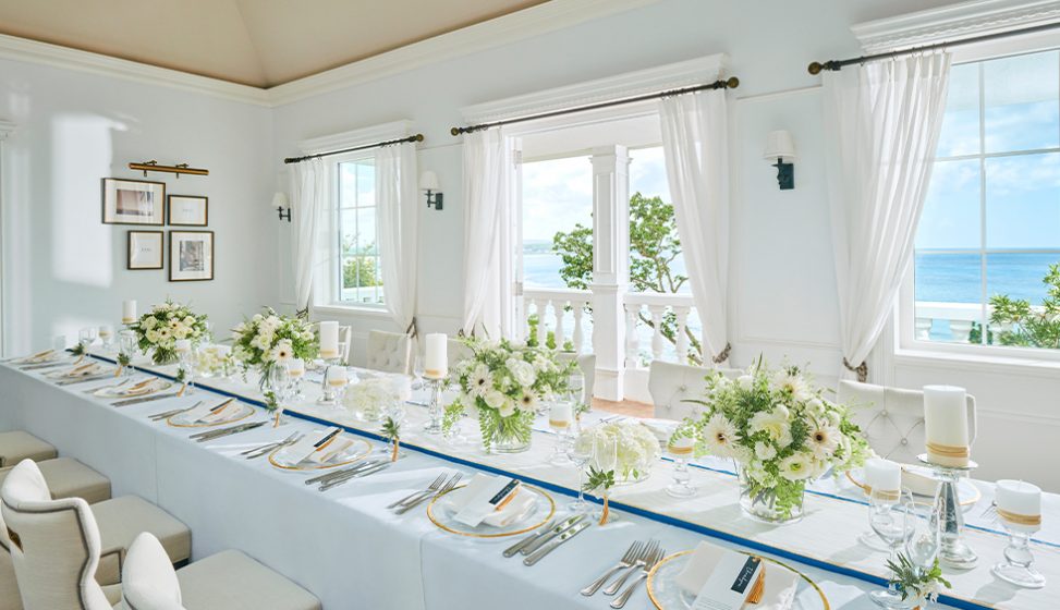 タモン湾を見渡す高台に佇むウエディング・ヴィレッジは、チャペル・パーティ会場・フォトスタジオ・ウエディングサロンが一体となった贅沢なプライベート空間。ゲートを開くと、そこには緑あふれるトラディショナルな街並みをイメージさせる洗練された世界が広がります。