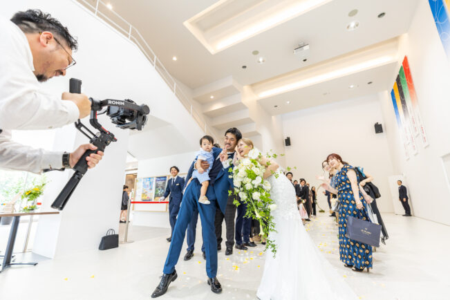 パーティー会場と同じ建物内にある挙式会場では、お互いの表情が見える距離感や自由度の高さが人気の人前式を行う事ができます。お二人らしい誓いを立てた後は、集合写真やパーティー会場への移動などもスムーズに行えます。