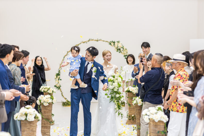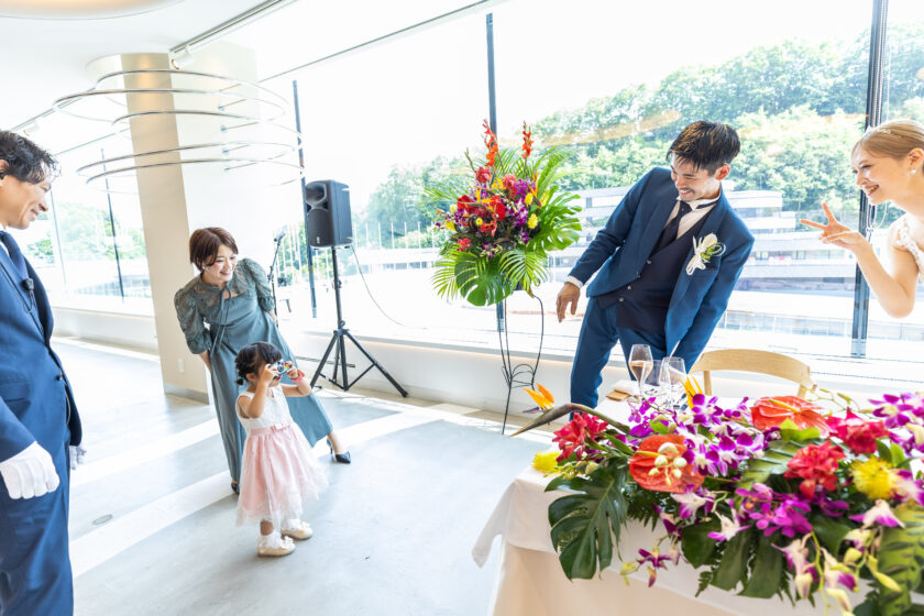 パーティー会場と同じ建物内にある挙式会場では、お互いの表情が見える距離感や自由度の高さが人気の人前式を行う事ができます。お二人らしい誓いを立てた後は、集合写真やパーティー会場への移動などもスムーズに行えます。