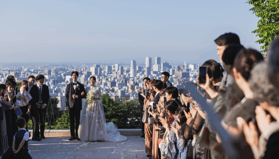 一般的に、挙式後に慌ただしくパーティ会場に移動することの多い独立型教会での結婚式。しかし、ここローズガーデンでは、札幌市内一望の景色の中で、挙式の余韻を参列者と共に楽しめる時間をご用意しています。ご両親やゲストの皆様に参列のお礼を伝えてまわったり、素晴らしい景色の中で写真を残したり、バルーンリリースなどのイベントを楽しんだりと、お二人のニーズに合わせた温かな時間をプランナーが一緒にご用意いたします。