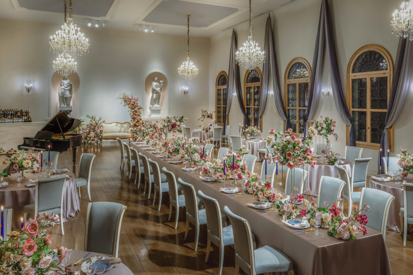 円山の伏見にある、ヨーロッパスタイルの2会場を使うことができるゲストハウスです。パーティの本来の楽しさである「食事と会話」を楽しむメインバンケットと「演出」を楽しむデザート専用ルームを使った今までにない自由で新しいスタイルが特徴の会場です。お料理も京都のミシュランガイド星付レストランとコラボした創作フレンチ懐石が味わえるため、ゲストの満足度が非常に高い会場です。