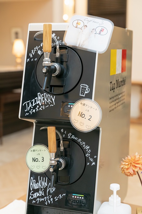 挙式前にはおつまみビュッフェとタップマルシェ(クラフトビールサーバー)、披露宴では料理の他にデザートビュッフェを用意しました。また、披露宴ではシャンパン飲み放題、タップマルシェで人気投票1位になったクラフトビールのサーバーを設置しました。